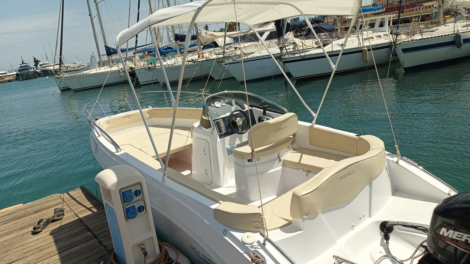 Barca nuova, appena uscita dal cantiere. La nuova chiglia, abbondante nei volumi di prua, garantisce stabilità e comodità. Generosi cuscini prendisole, comode sedute laterali e a poppa e ampio tendalino. La barca perfetta per godersi comodamente il mare e le sue bellezze. Tutti i migliori accessori sono presenti a bordo, compresa la doccia e la scaletta di risalita.